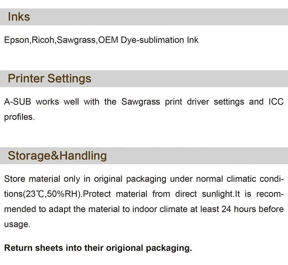 - Compatibilidad versátil 🖨️🎨: El papel de sublimación A-SUB es compatible con una variedad de impresoras de sublimación, incluidas EPSON, SAWGRASS, RICOH, Brother y más. Perfecto para poliéster de alta calidad, materiales con hasta un 30 % de contenido de algodón, cerámica de primera calidad, azulejos, fundas para teléfonos y placas de metal, ampliando sus posibilidades creativas.